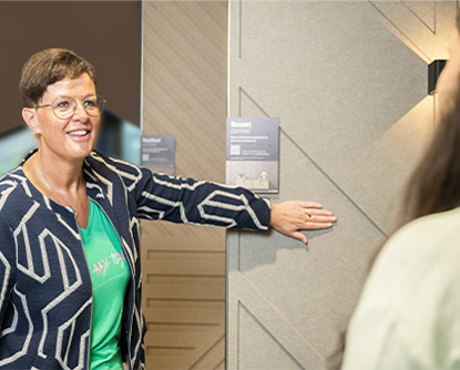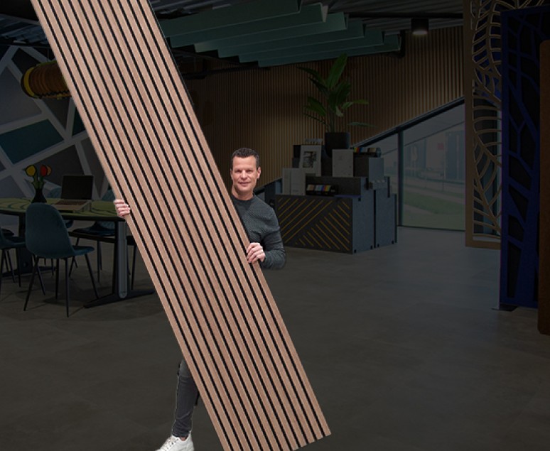 Benieuwd hoe akoestisch PET-vilt er in het echt uitziet en hoe het aanvoelt? Kom langs in onze showroom in het midden van het land. Ervaar de veelzijdigheid aan oplossingen voor wand, plafond en ruimteverdeling en doe inspiratie op voor jouw interieur project.