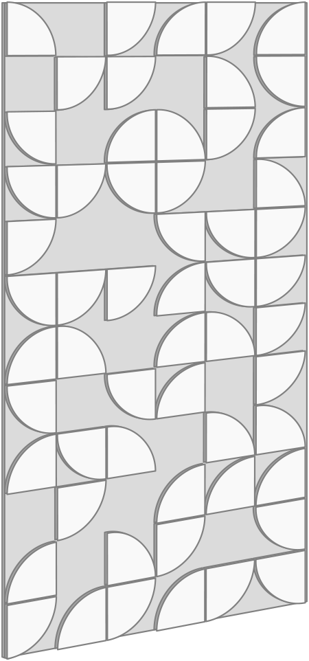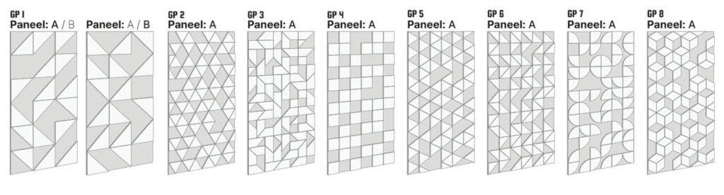 Keuze uit 8 verschillende patronen, waarbij binnen hetzelfde patroon paneel A doorloopt en aansluit op paneel B. Bestel je meerdere panelen van hetzelfde patroon (bijvoorbeeld aantal 3) dan ontvang je paneel A + B + A, bij een aantal van bijv. 4 panelen ontvang je A + B + A + B.