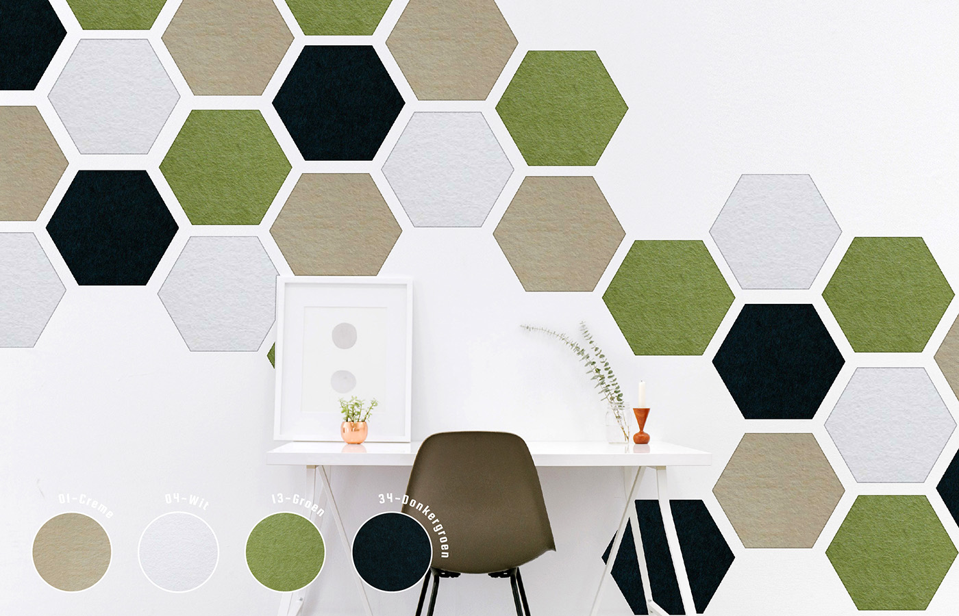 De Hexagon is een echte sfeermaker en geeft ieder oppervlak een dynamisch beeld. De combinatie van de speelse vorm en de geluidsdempende werking van PET-vilt maakt Tacito’s Hexagon de ideale wanddecoratie voor iedere ruimte.