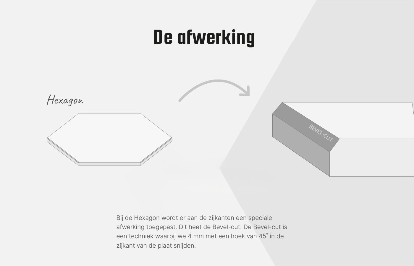 Een strakke en speelse wand creëer je met Tacito’s Hexagons. Varieer in kleur en bestel meerdere sets of ga voor één kleur voor een mooi en rustig geheel. Je kunt kiezen uit twee maten Hexagons: 250 bij 217 mm en 385 bij 334 mm. We werken de Hexagons af met een speciale ‘Bevel-cut’, voor een ultrastrakke afwerking.