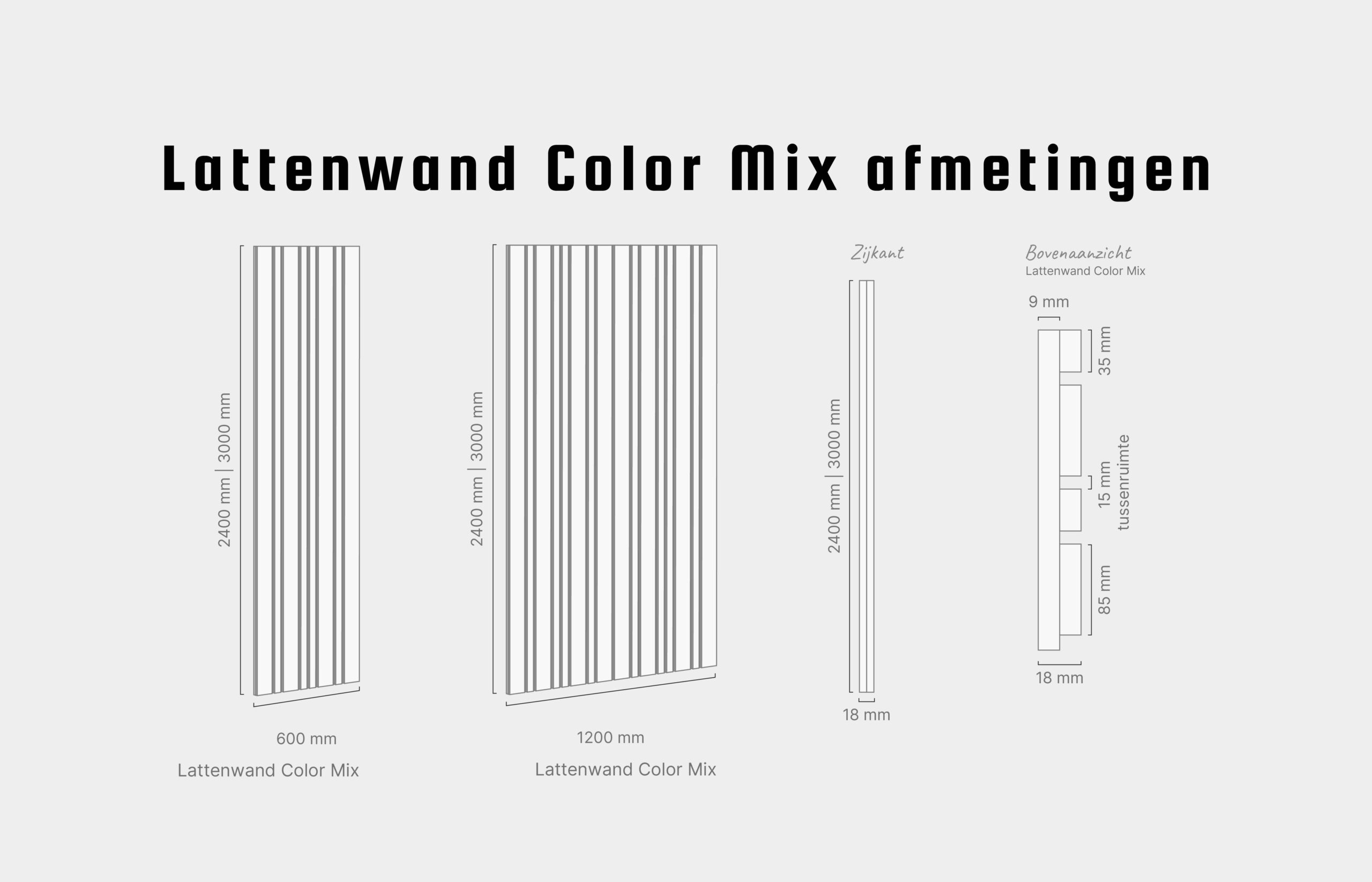 | Lattenwand Color Mix 600 | 600 x 2400 mm | 18 mm PET-vilt | 1,44 m² | 2 stuks |
