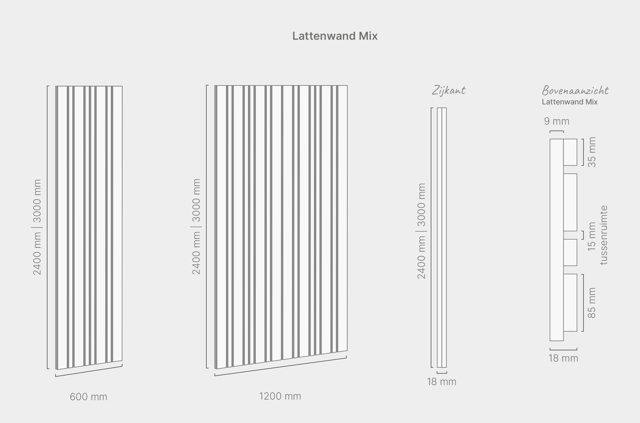 | Lattenwand Breed 600 | 600 x 2400 mm | 18 mm PET-vilt | 1,44 m² | 1 stuks |
