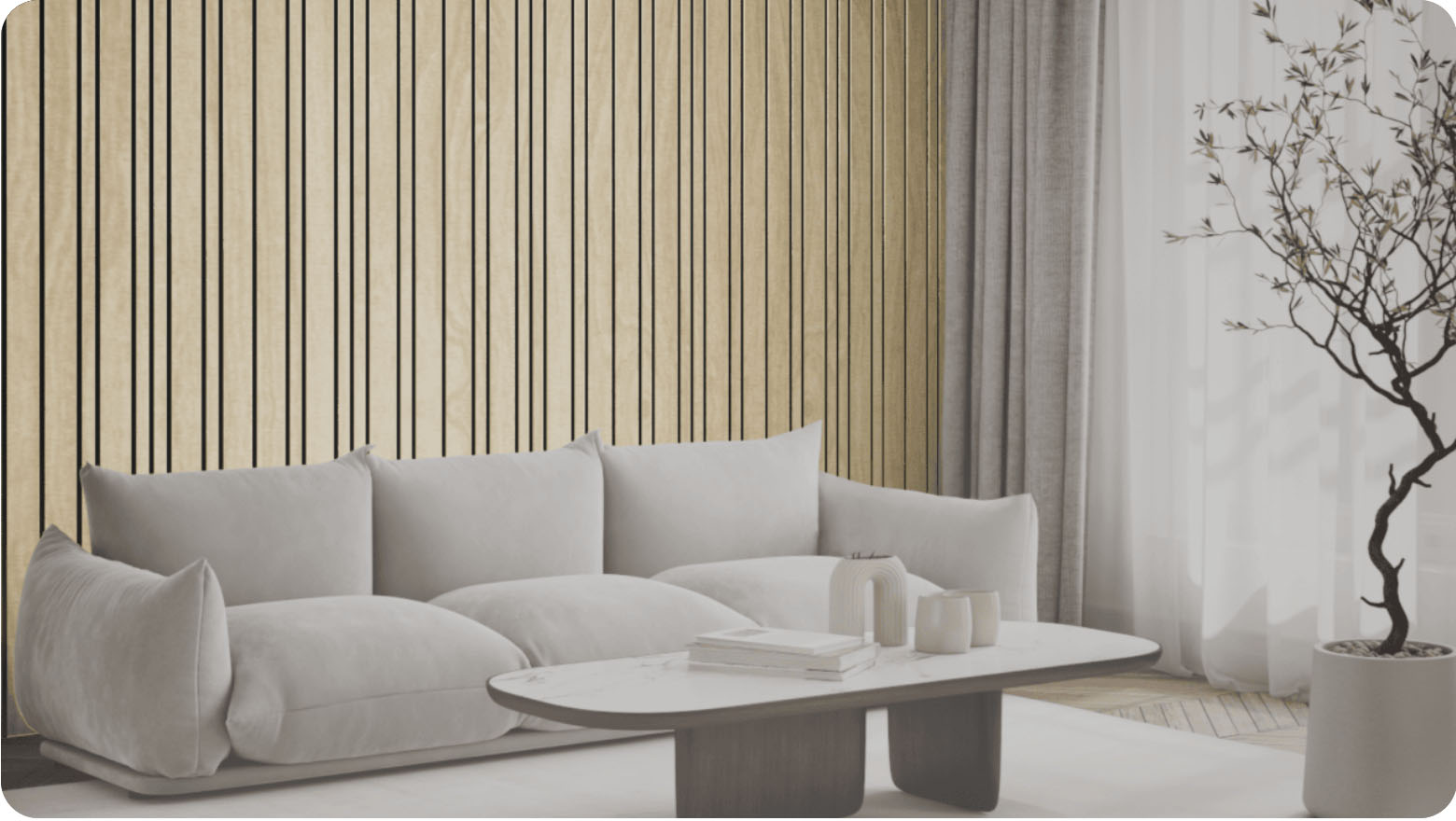 Een mooie combinatie van de smalle en brede latten. Een andere uitstraling maar met dezelfde eigenschappen. Kies je voor Tacito’s Lattenwand (2 lagen PET-vilt), dan profiteer je niet alleen van de prachtige looks, maar minimaliseer je ook de geluidsreflectie van harde oppervlakken. Een ideale, duurzame en stijlvolle oplossing met akoestische panelen geschikt voor iedere ruimte.