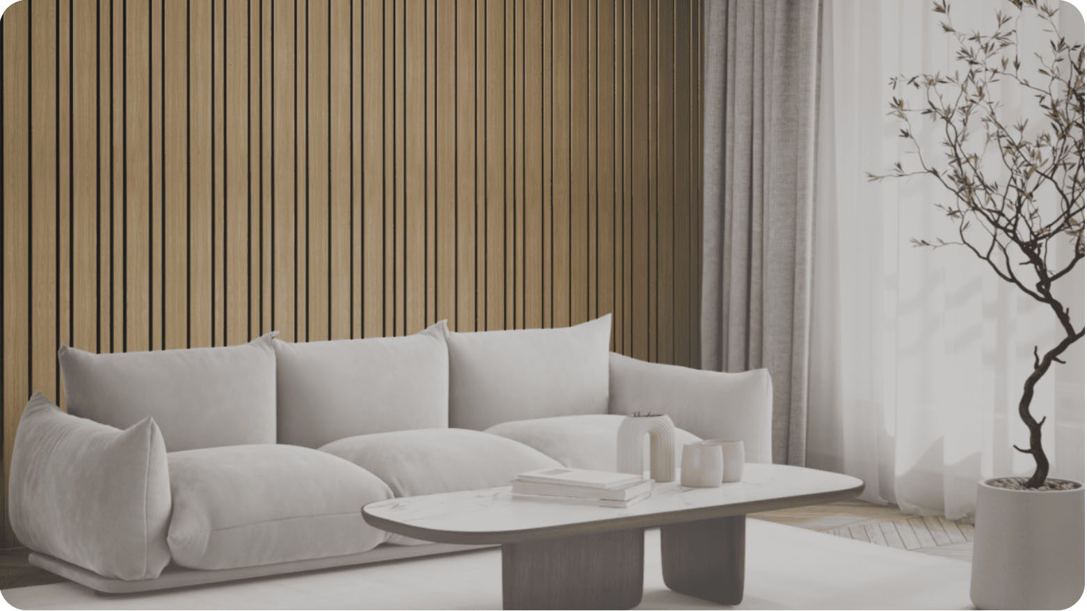 Een mooie combinatie van de smalle en brede latten. Een andere uitstraling maar met dezelfde eigenschappen. Kies je voor Tacito’s Lattenwand (2 lagen PET-vilt), dan profiteer je niet alleen van de prachtige looks, maar minimaliseer je ook de geluidsreflectie van harde oppervlakken. Een ideale, duurzame en stijlvolle oplossing met akoestische panelen geschikt voor iedere ruimte.