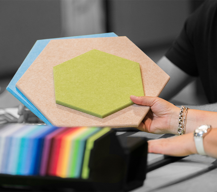 Met de maatwerk opties van akoestische PET-vilt producten kun je eindeloos mixen en matchen. Kies uit 48 kleuren, diverse oppervlakken en unieke prints. Creëer gepersonaliseerde oplossingen die perfect passen bij elk interieurontwerp, of het nu gaat om wandpanelen, plafonddecoratie of scheidingswanden.