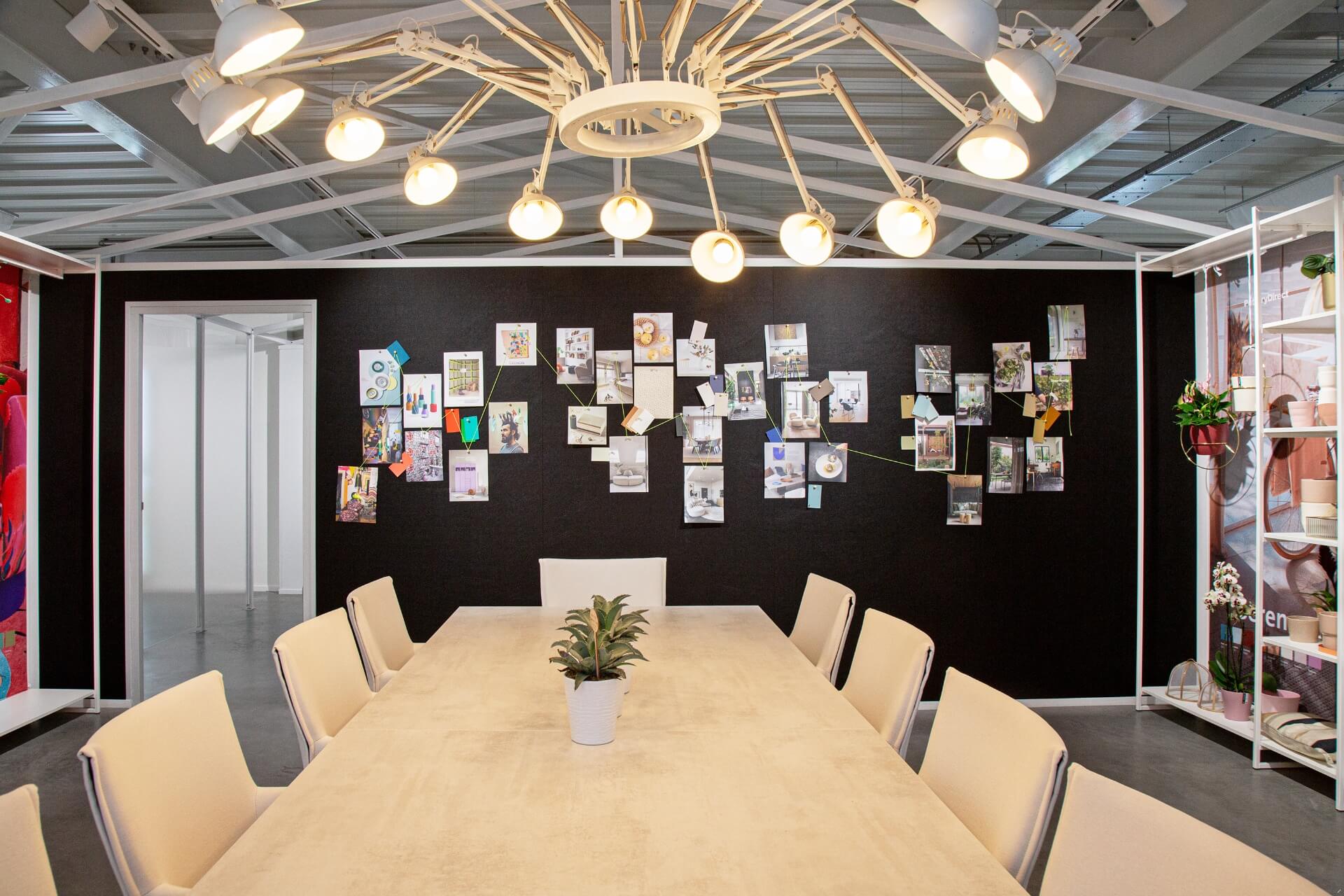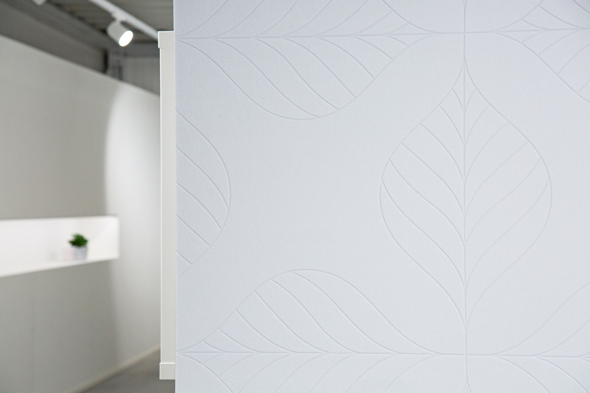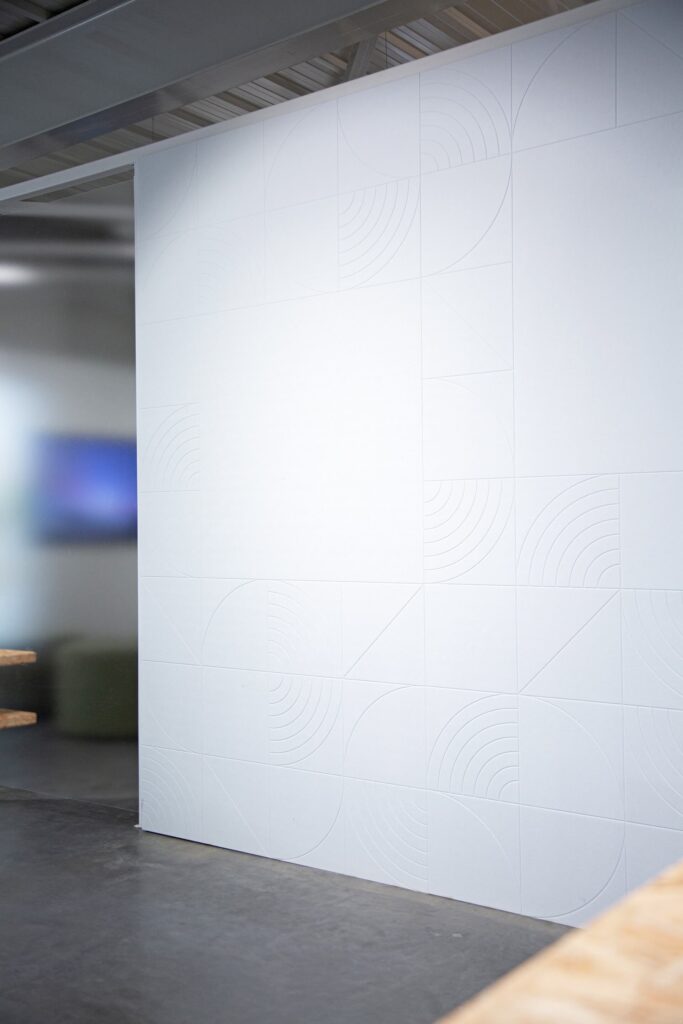We hebben gekozen voor wandvullende panelen van PET-vilt, die we tegenover elkaar hebben ingezet. Dit dempt de galm door de vele harde materialen die dit pand rijk is. Zo kan het team van Pottery Direct hier in alle rust werken en met klanten afspreken. Voor een stijlvolle look hebben we verschillende grafische patronen in het PET-vilt gesneden.