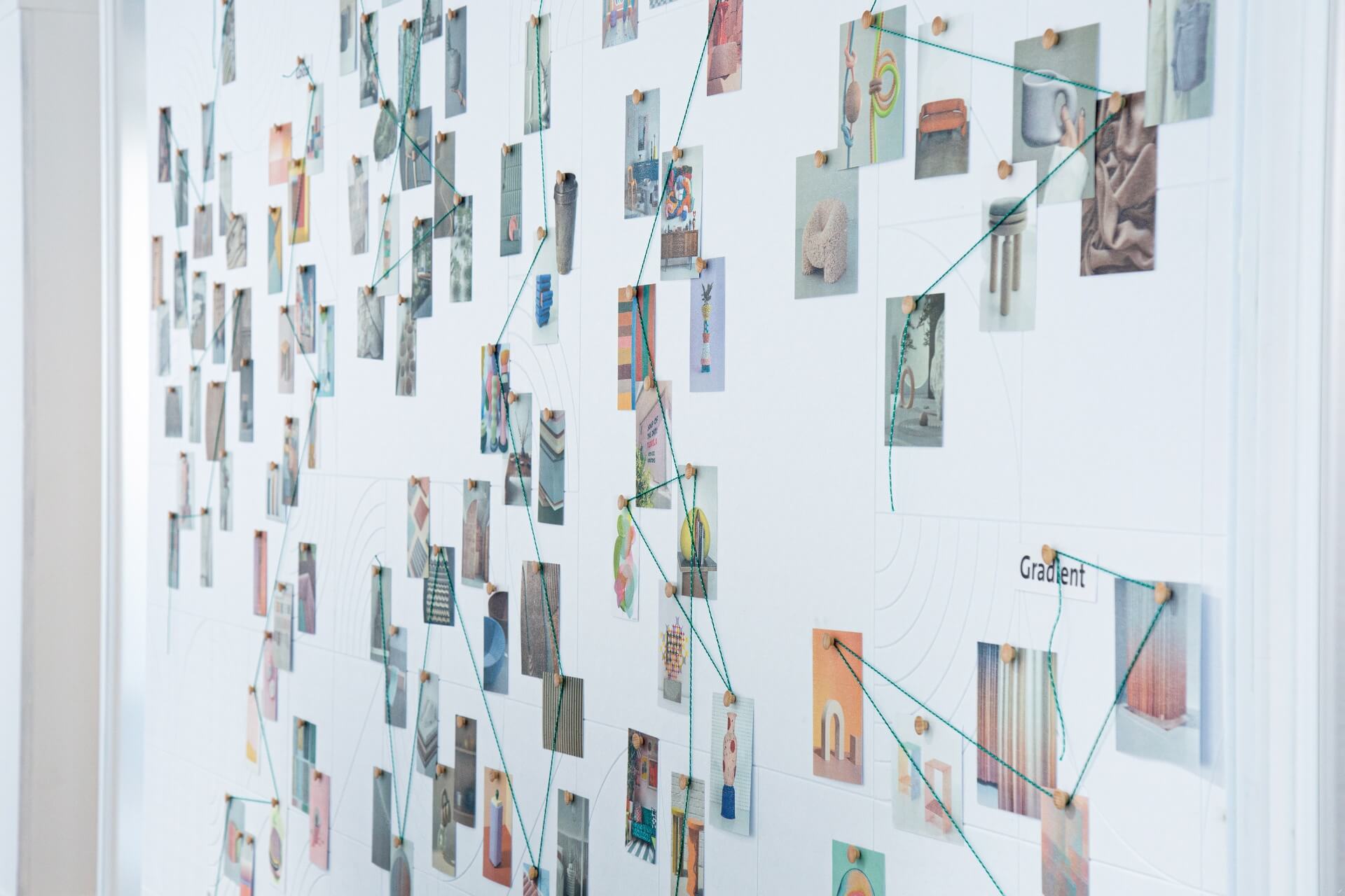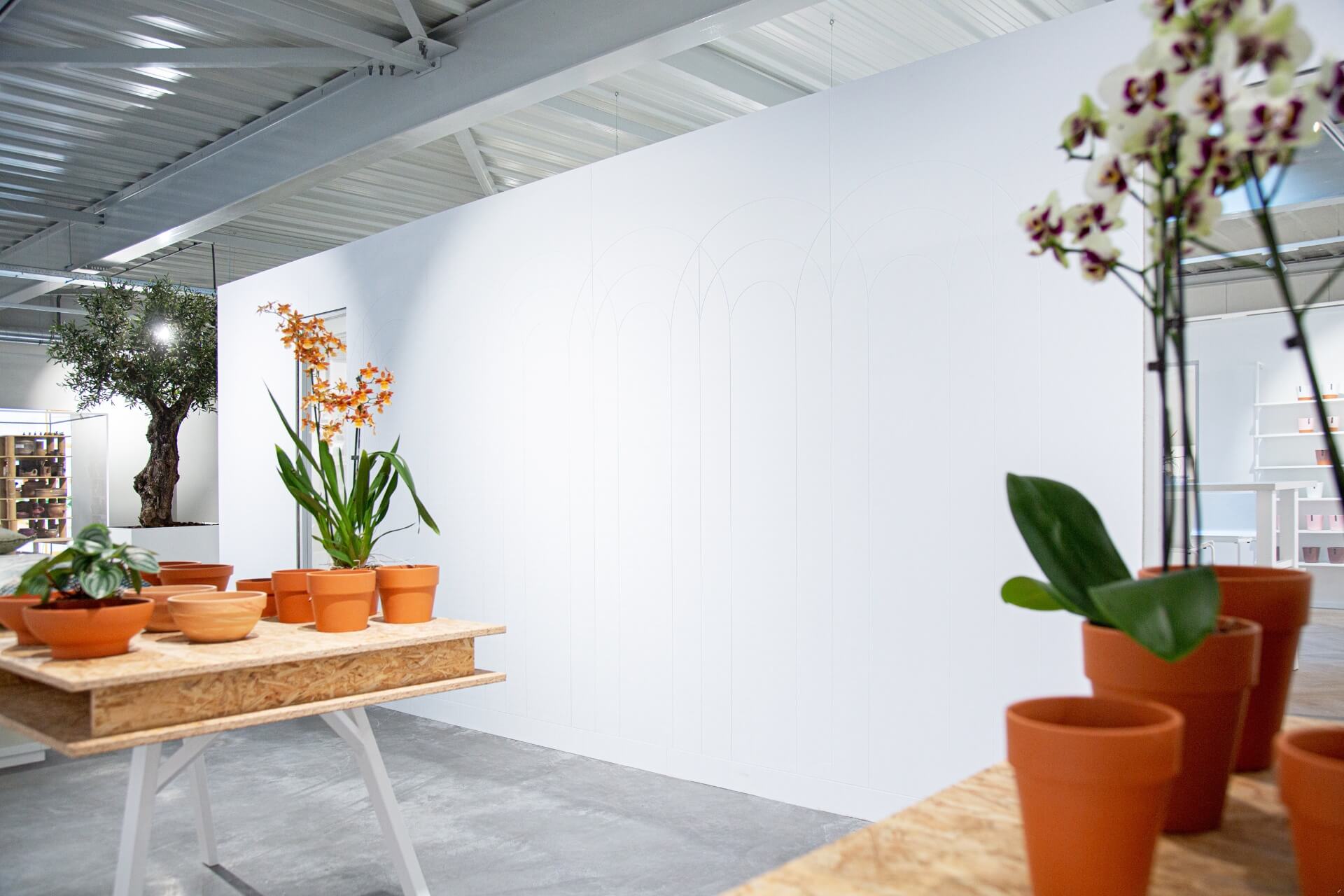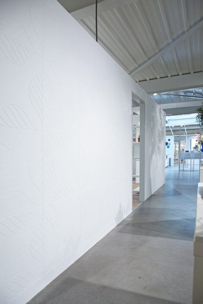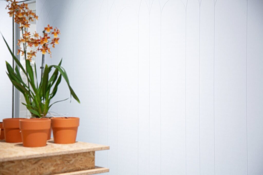 We hebben gekozen voor wandvullende panelen van PET-vilt, die we tegenover elkaar hebben ingezet. Dit dempt de galm door de vele harde materialen die dit pand rijk is. Zo kan het team van Pottery Direct hier in alle rust werken en met klanten afspreken. Voor een stijlvolle look hebben we verschillende grafische patronen in het PET-vilt gesneden.