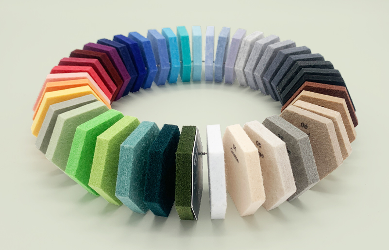 PET-vilt is een duurzaam materiaal. Het PET-vilt akoestische paneel is halfstijf en gemaakt van 100% polyestervezel. Onze PET-vilt panelen bevatten minimaal 75% gerecycled materiaal van PET-flesvlokken (na consumptie). Ons polyestervezel akoestisch paneel is volkomen veilig, niet giftig, niet allergeen en niet irriterend.
